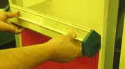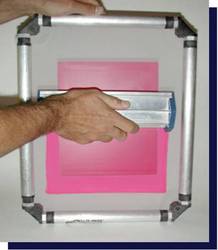 Wear gloves, goggles, and protective clothing. Make a stencil with QT-DISCHARGE direct emulsion. Dry the screen and stencil. Apply Hardener D to both sides of the screen with a soft-bristled brush, a sponge, or a work rag. - ALLOW FIXER 9 TO DRY