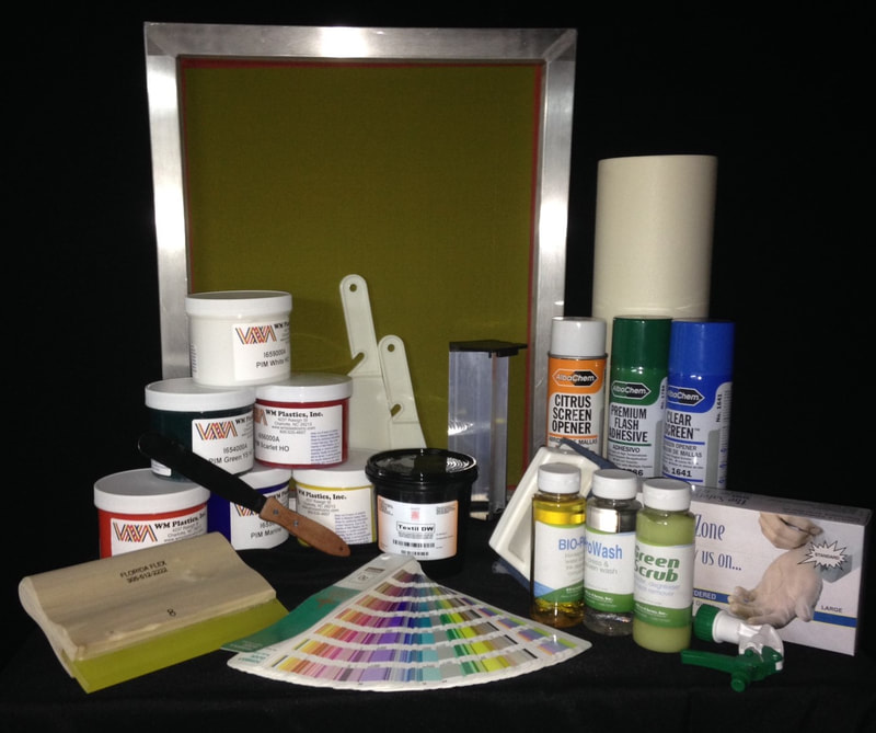 Aluminum Screens (3) 160 & (1) 110mesh, 6-color Plastisol Ink kit, 1 quart of Textil PH Photo Emulsion, 1 Emulsion coater 16" long, 4 Wooden Squeegees 14" w/70duro, 2 Wooden Squeegees 6" w/70duro, T-Square, 1 Spot Cleaning w/ Fluid, 6 Plastic Ink Spatulas, 1 Reclaiming KIT 1qt/ea Emulsion Remover, BIO1 Ink Wash, Press Wash, 3 Brushes & Sprayers, 1 can Mist Adhesive, 1 can Screen Opener, 1 pack Temperature Test Labels, 1 roll Screen Blockout Tape.